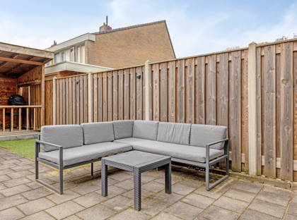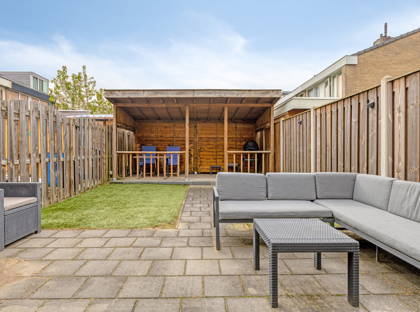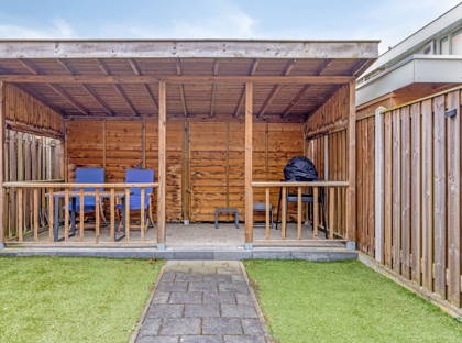 De achtertuin is verzorgd aangelegd met een terras, kunstgras en een overkapping. Achterin bevindt zich een aanpandige stenen berging. Tevens beschikt de woning over een tweede aanpandige stenen berging aan de voorzijde, ideaal voor extra opslag of het stallen van fietsen.