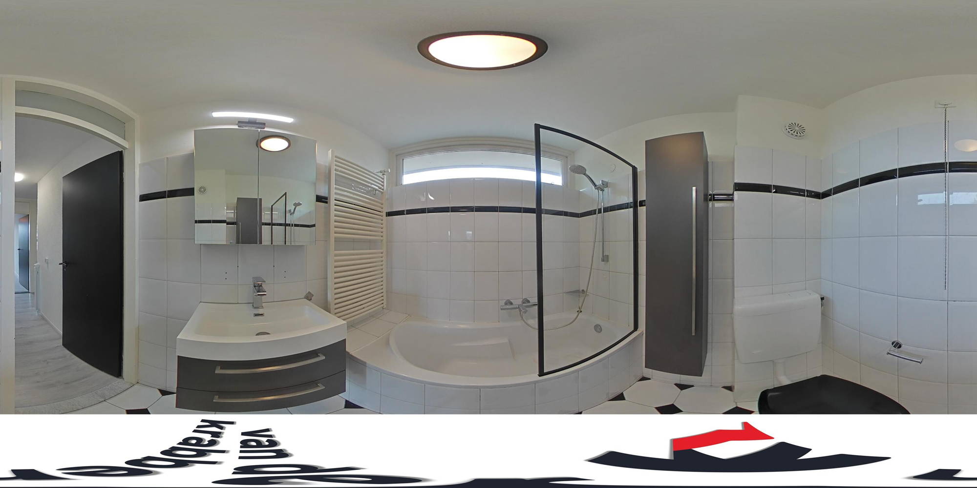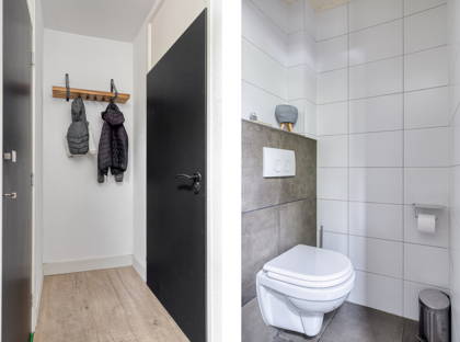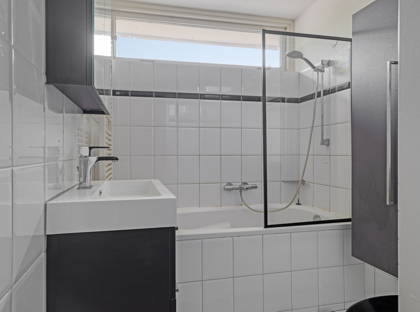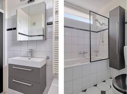 De badkamer is compleet uitgevoerd met een toilet, wastafelmeubel, douche-/badcombinatie en een designradiator.