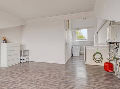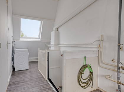 Op de voorzolder bevinden zich de aansluitingen voor witgoed en de Remeha cv-ketel uit 2015.