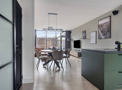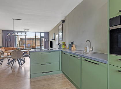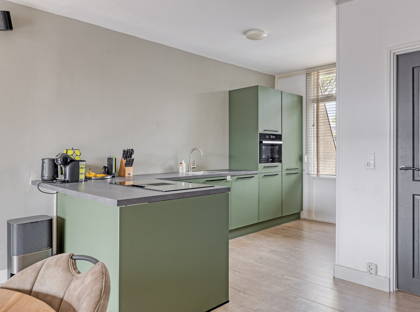 De moderne vernieuwde keuken beschikt over een kunststof werkblad en is compleet uitgerust met een 4-pits inductiekookplaat met geïntegreerde afzuiging, vaatwasser, combimagnetron, koelkast en vriezer. Daarnaast is er een handige trapkast aanwezig.
