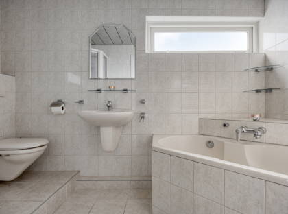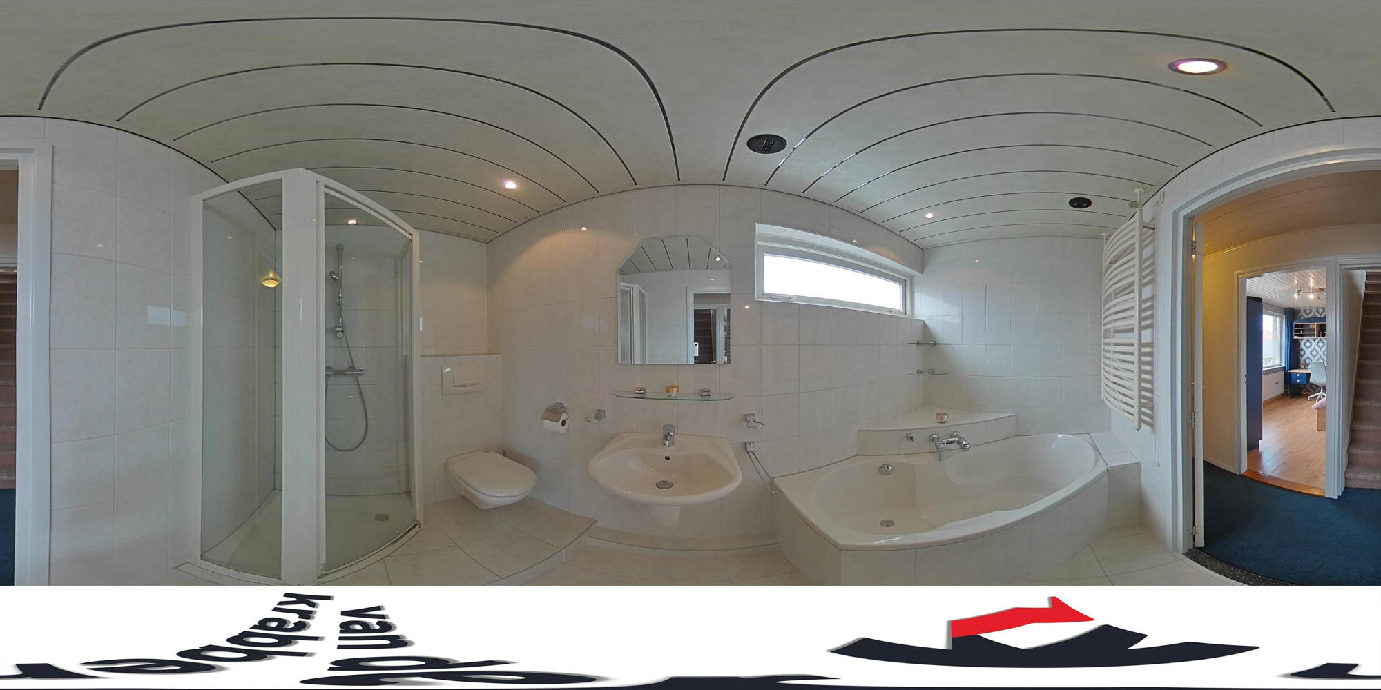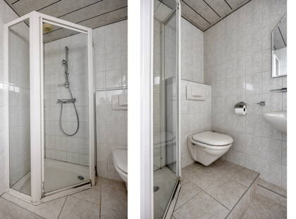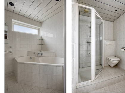 + Volledig betegelde badkamer met raam. Voorzien van ligbad, douche, wastafel en toilet.