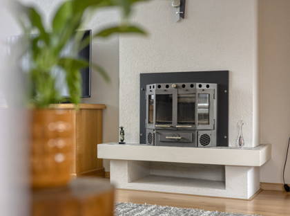 Vanuit de hal stap je binnen in de ruime, lichte woonkamer, met aan beide kanten grote ramen. De schouw met houtkachel maakt dit een gezellige warme plek. Aangrenzend vind je de keuken.