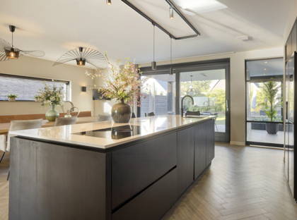+ De luxe woonkeuken is van alle gemakken voorzien. Naast de hoogwaardige BORA inductiekookplaat met geïntegreerde afzuiging, beschikt de keuken over een Quooker, stoomoven, combi-oven, vaatwasser, ingebouwde Amerikaanse koelkast en coffee corner. Daarnaast is het kookeiland voorzien van een barretje om aan te zitten.