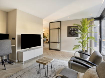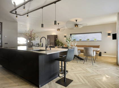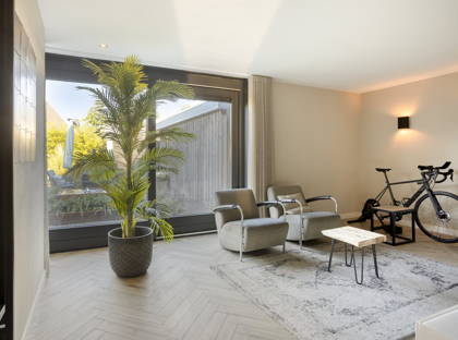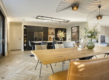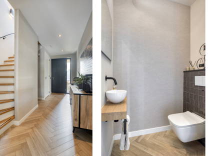 + De begane grond is strak afgewerkt met een prachtige visgraatvloer en slimme verlichting.