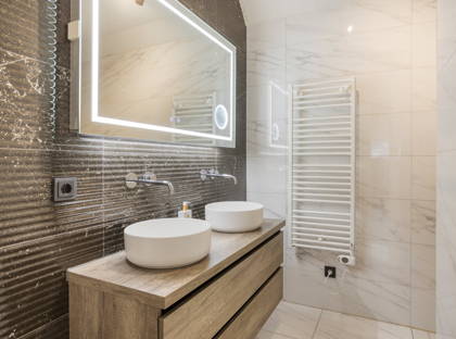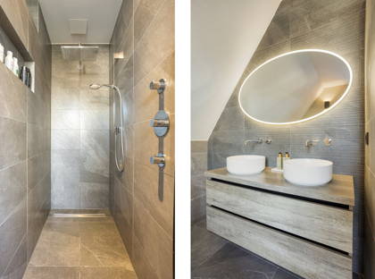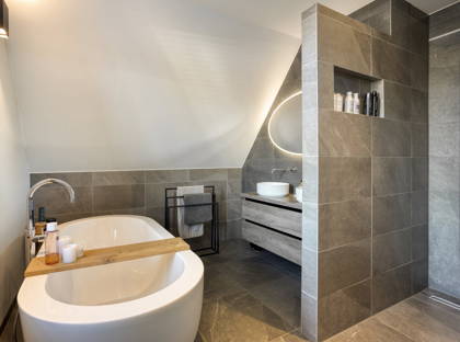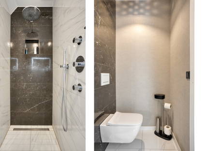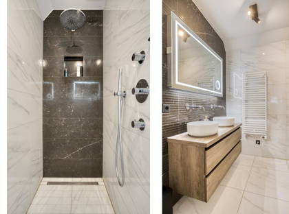 + De tweede stijlvolle badkamer is voorzien van een badkamermeubel met dubbele wastafel, ruime inloopdouche en designradiator. Ook is hier een separate toiletruimte aanwezig.