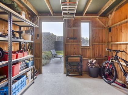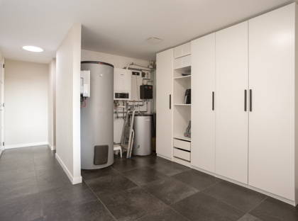 + In de berging, voorzien van een plavuizenvloer, vind je naast de meterkast ook de luchtwarmtepomp, een praktische kastenwand, een uitstortgootsteen en de tweede toiletruimte met wandtoilet.
