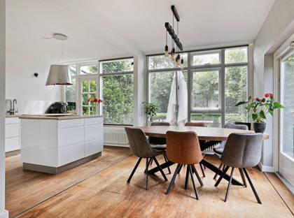 + De eethoek staat in directe verbinding met de achtertuin dankzij de openslaande deuren, waardoor binnen en buiten op een natuurlijke manier in elkaar overlopen.