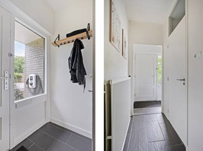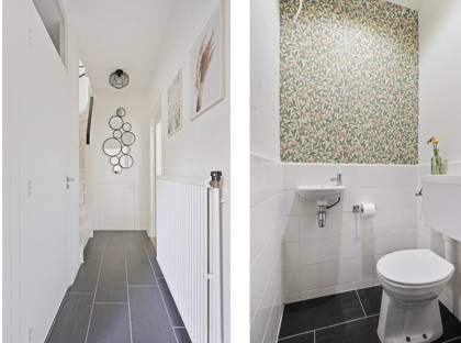 + Je komt binnen in de lichte hal met toegang tot de garderobehoek, meterkast, trapopgang, praktische trappenkast en moderne toiletruimte met toilet en fonteintje.