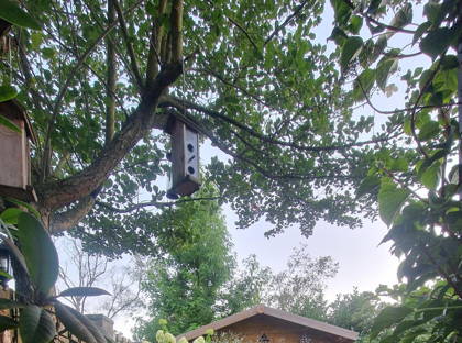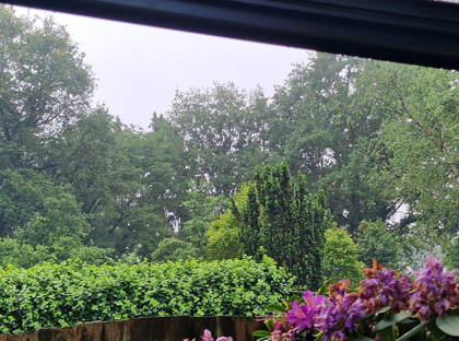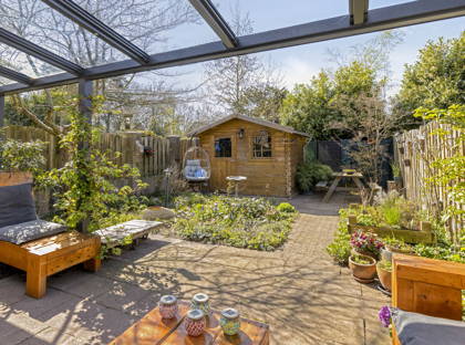 De achtertuin op het westen is een heerlijke plek om te ontspannen, met vrij uitzicht op het gemeentegroen. Achterin staat een volledig geïsoleerd houten tuinhuis met elektra – ideaal als hobbyruimte of opslag.
