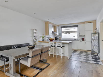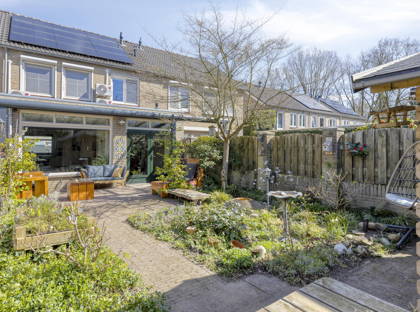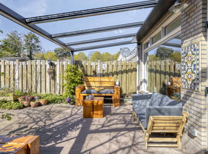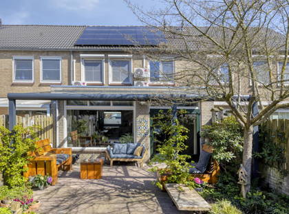 De woning is uitgebouwd en biedt volop leefruimte voor het hele gezin. Daarnaast is de woning goed verduurzaamd met onder andere 12 zonnepanelen (2021), na-isolatie van de spouwmuur en een energielabel B. De woonkamer is sfeervol afgewerkt met een massief eikenhouten vloer, spachtelputz wanden en een strak spuitwerk plafond. Dankzij de gashaard en airconditioning, die kan verwarmen en koelen, is het hier het hele jaar door comfortabel. Via de openslaande tuindeuren bereik je de zonnige achtertuin op het westen, compleet met een aluminium overkapping voorzien van elektrische zonwering en verlichting.