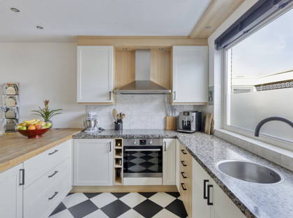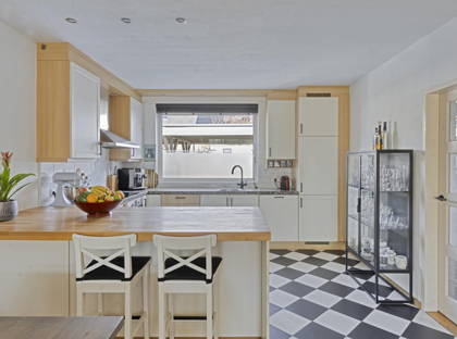 De moderne keuken is van alle gemakken voorzien, waaronder een 4-pits inductiekookplaat, afzuigkap, koelkast, vriezer, oven en een stijlvol composiet werkblad gecombineerd met hout. Het bar-gedeelte maakt deze keuken een gezellige plek om samen te komen.