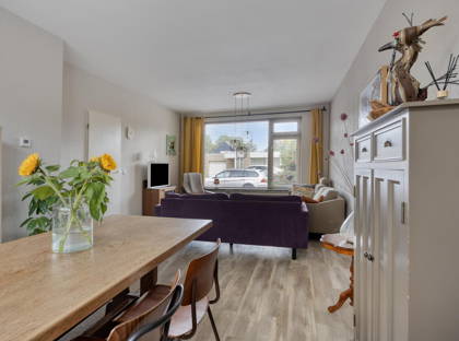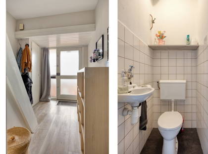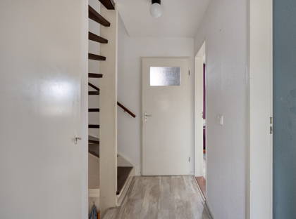 Via de entree met meterkast, toilet en trapopgang bereik je de woonkamer. De lichte woonkamer heeft een laminaatvloer. Onder de trap bevindt zich een handige trapkast voor extra opbergruimte.