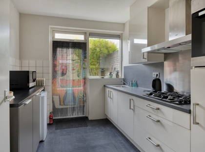 De keuken is praktisch ingericht en uitgerust met een koelkast, oven, gaskookplaat en afzuigkap. Vanuit de keuken is er toegang tot de achtertuin, die beschikt over een achterom en een aangebouwde houten berging. Aan de zijkant van het huis bevindt zich bovendien een garage.