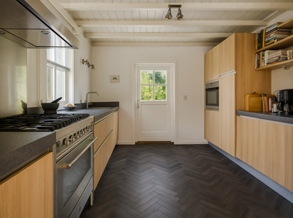+ Op de vloer in de keuken ligt iniddels een donkere visgraat pvc, we hebben een sfeerimpressie daarvan toegevoegd aan de foto's.