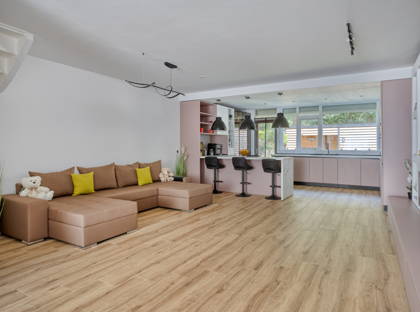 Je komt binnen via de eigen carport en voortuin. In de hal vind je de moderne toiletruimte (2024) met hangend toilet en fonteintje, uitgevoerd met een laminaatvloer. Vanuit hier stap je de ruime woonkamer in, waar de lichte afwerking en de praktische indeling direct opvallen.