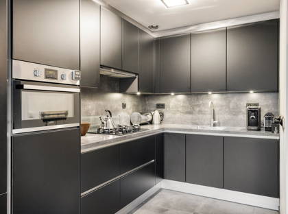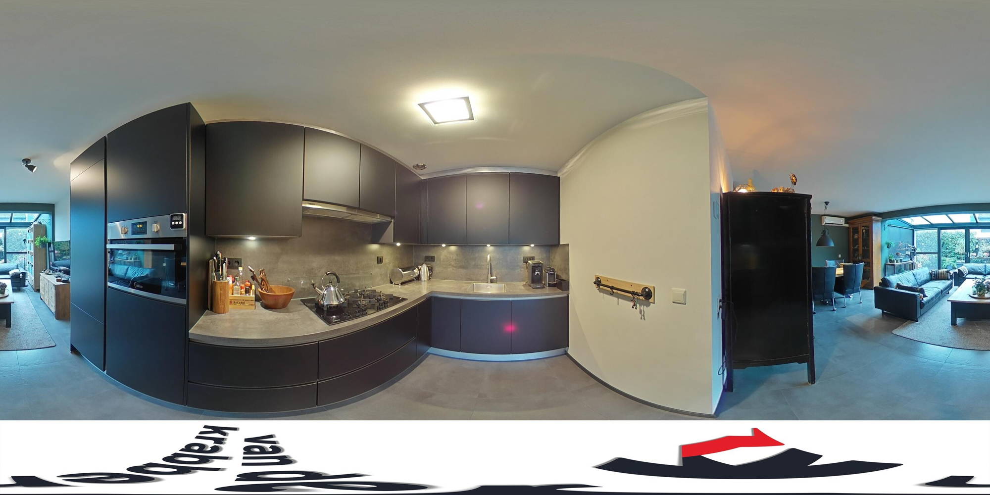 + In de keuken staat een modern keukenblok in hoekopstelling. Het is voorzien van een stijlvol werkblad en aansluitende spatwand, 4-pits-kookplaat, afzuigkap, combi-oven, koelkast en vaatwasser. ??