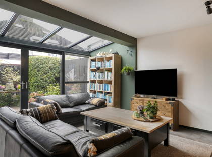 De moderne keuken sluit hier vervolgens mooi op aan. En de serre - met flexibele glaswand - biedt een tweede tuingerichte zithoek. Boven heb je verder nog de beschikking over twee ruime slaapkamers (voorheen drie), een moderne badkamer en bergzolder. Waarbij ook in de hoofdslaapkamer airco aanwezig is.