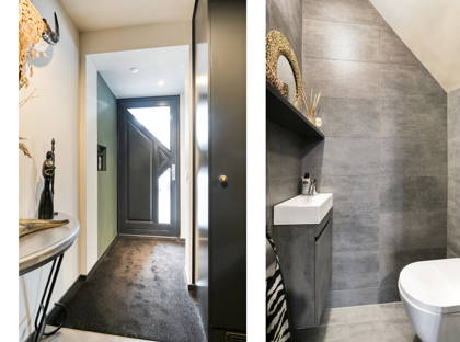 + Via overkapte voordeur binnenkomst in de hal met de meterkast, trap en toiletruimte De stijlvolle toiletruimte (2023) bevat een wandtoilet en fonteintje.