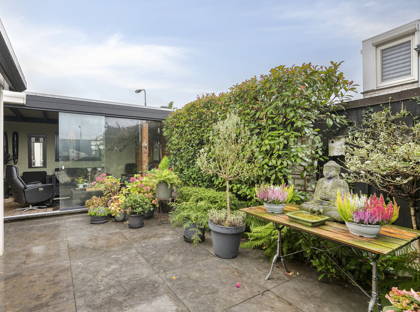 + Achtertuin op het westen is geheel betegeld en daardoor onderhoudsarm. De tuin is groen ingericht met fraai beplante borders.