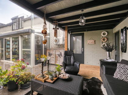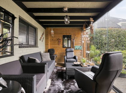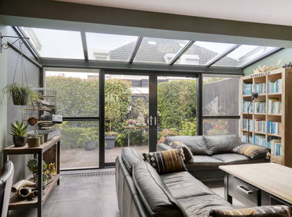 + De serre is een heerlijke plek voor nog een tuingerichte zithoek. De flexibele glasgevel kan geheel geopend of gesloten worden. Een zonnescherm biedt extra beschutting.