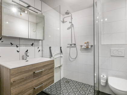 + Moderne badkamer is geheel betegeld en voorzien van centrale ventilatie, een inloopdouche met hand- en regendouche, wandtoilet en badkamermeubel.