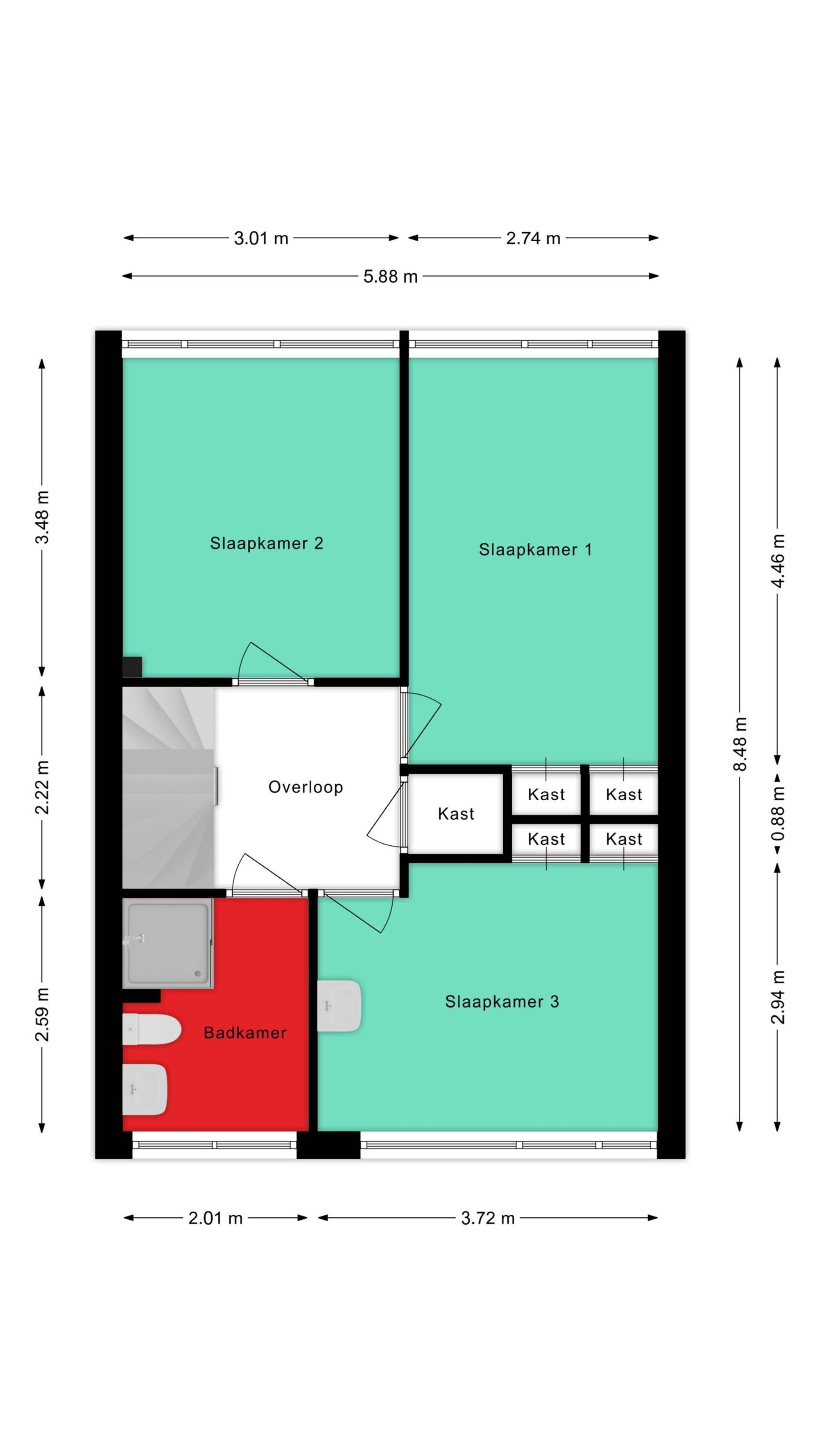 Overloop met toegang tot drie slaapkamers. Badkamer voorzien van toilet, wastafel en douche.