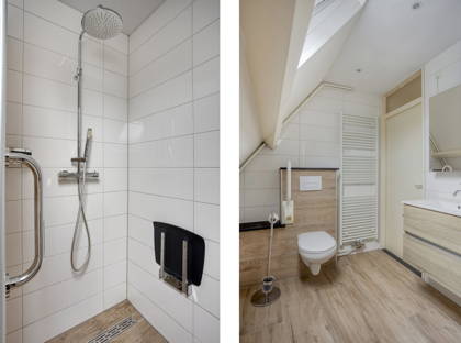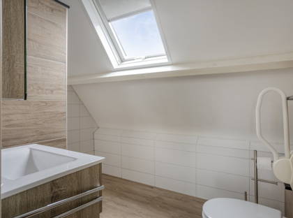 Ook de tweede verdieping is uitgevoerd met een betonvloer, wat zorgt voor een prettige, stabiele woonbasis. Hier bevinden zich een volwaardige vierde slaapkamer en een voorzolder met extra bergruimte, ideaal voor het opbergen van seizoensspullen of als wasruimte.
