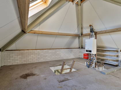 Op de 1e verdieping zijn 3 slaapkamers en een badkamer. Vanuit een van de slaapkamers stap je zo het balkon op. Een fijne plek om ’s ochtends lekker je koffie te drinken. De badkamer is voorzien van douche, wastafel en toilet. En met de vlizotrap op de overloop betreed je de zolder. Opbergruimte genoeg, in deze woning.