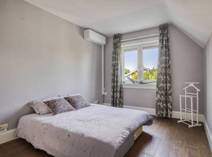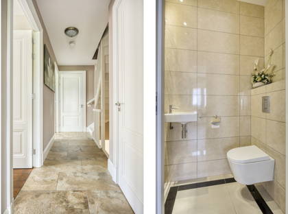 Op de eerste verdieping zijn drie slaapkamers, waarvan twee met ingebouwde kasten. De hoofdslaapkamer is voorzien van airconditioning – lekker koel in de zomer. Op de overloop is een separaat toilet en de badkamer is uitgerust met een ligbad, inloopdouche en dubbel wastafelmeubel. Het raam zorgt voor extra ventilatie en daglicht.