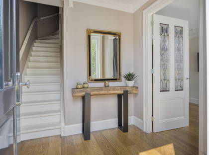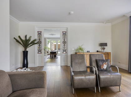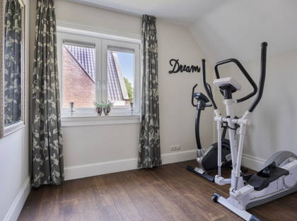De keuken is een fijne plek waar je aan de eettafel zit met uitzicht op de tuin. Er zijn openslaande tuindeuren, veel lichtinval en de keuken zelf is uitgerust met een 7 pits gasfornuis, afzuigkap, 3 ovens, magnetron en vaatwasser. Aansluitend is er een bijkeuken met keukenblok, witgoedaansluitingen, toilet en toegang tot de oprit – handig voor de boodschappen of als je met natte jassen thuiskomt. Een prachtig detail aan deze woning is dat de binnendeuren op de begane grond zijn voorzien van hand gemaakt glas-in-lood.