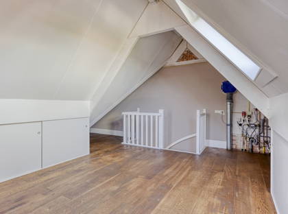 De zolder is een grote open ruimte met de cv-installatie en volop mogelijkheden: een extra slaapkamer, werkkamer of hobbyruimte? Alles kan! Aan de zijkanten bevinden zich schuifkasten. Ideaal voor het opbergen van spullen.