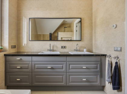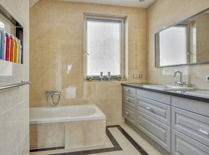 + Badkamer met ligbad, inloopdouche en dubbel wastafelmeubel