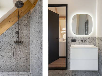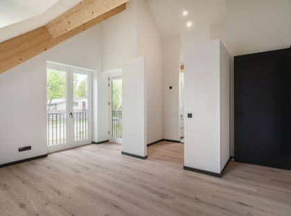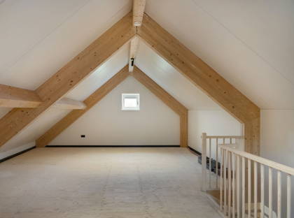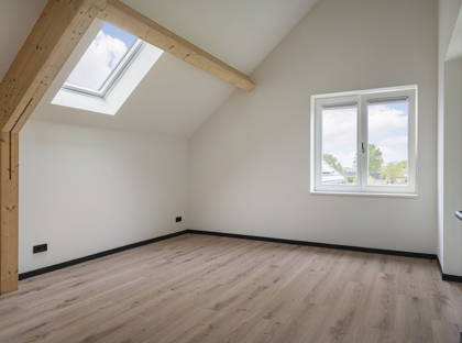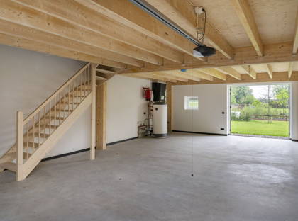 Boven de garage bevindt zich nog een grote ruimte die via een vaste trap te bereiken is. Deze ruimte kan perfect dienen als extra opslagruimte, maar ook als sport-, speel- of ontspanningsruimte. De extra hoge plafonds, tot aan de nok, zorgen voor een grandioos ruimtelijk gevoel. De houten balken geven de ruimtes een warme, sfeervolle uitstraling.
