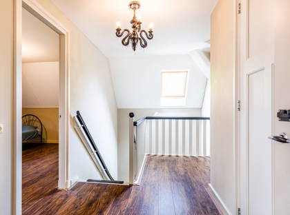 Op de eerste verdieping bevindt zich een badkamer met ligbad en dubbele wastafel. Daarnaast zijn er nog twee slaapkamers die voldoende ruimte bieden voor het hele gezin. Een garderobekast op de overloop zorgt voor extra opbergruimte en organisatiemogelijkheden. Bovendien is er een zolderruimte met een dakraam aanwezig, die kan dienen als extra opslagruimte of naar eigen inzicht kan worden gebruikt.
