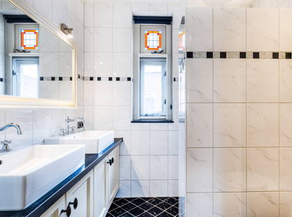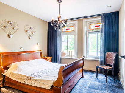 De woonkamer is voorzien van een stijlvolle tegelvloer en wordt verlicht door prachtige glas-in-loodramen die een charmant accent aan de ruimte geven. De woonkamer is opgedeeld in een gezellige zithoek en een aparte eetkamer, waardoor er voldoende ruimte is om te ontspannen en te dineren. De ruime deels open woonkeuken is eveneens uitgerust met een tegelvloer zoals in de hal en biedt een aangename plek om heerlijke maaltijden te bereiden. De keuken is voorzien van een gasfornuis, inbouwoven en magnetron, afzuigkap, koelkast en vaatwasser. Ook hier zorgen de glas-in-loodramen voor een karakteristieke uitstraling. Een aparte witgoedruimte/berging biedt extra opbergruimte en functionaliteit. Op de begane grond bevindt zich tevens een slaapkamer met inloopkast. Een inloopdouche met dubbele wastafel en extra toilet zorgt voor extra gemak.