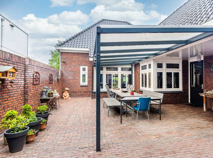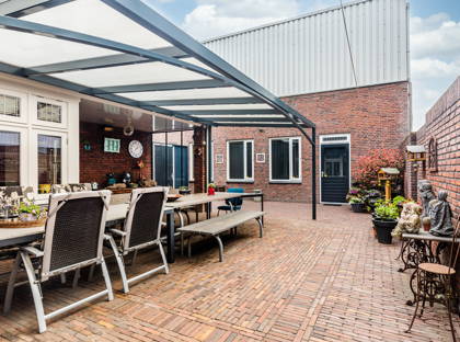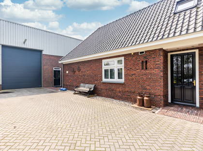 De achtertuin van de woning is geheel bestraat en voorzien van een overkapping, waardoor je het hele jaar door kunt genieten van buitenactiviteiten. Vanuit de tuin loop je direct de vrijstaande bedrijfshal in, waardoor de combinatie van wonen en werken naadloos wordt geïntegreerd. Deze bedrijfswoning biedt de perfecte balans tussen een comfortabele en functionele woonsfeer en uitstekende bedrijfsfaciliteiten.