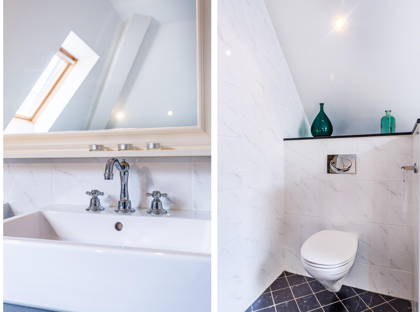 + Toilet (betegeld) met wasbak: Sanitaire voorzieningen binnen handbereik.