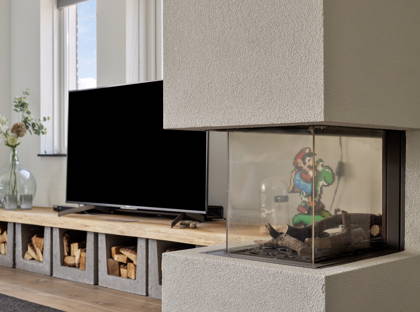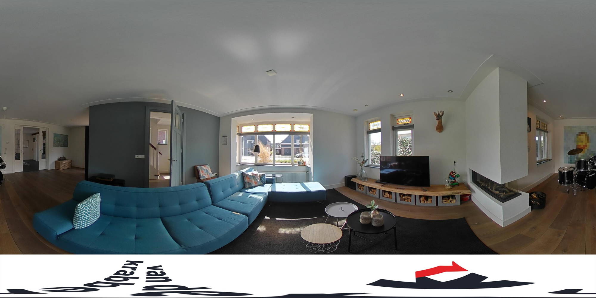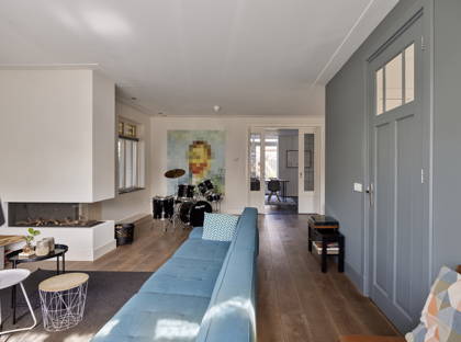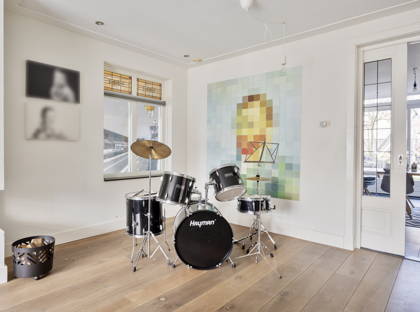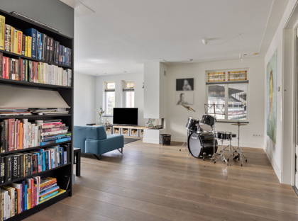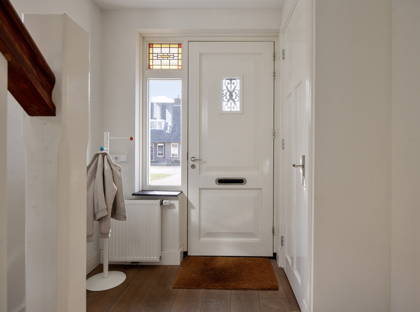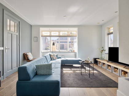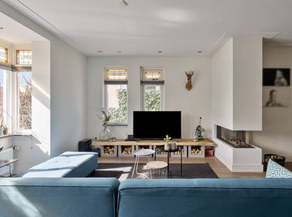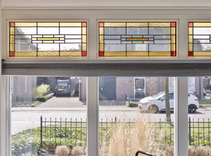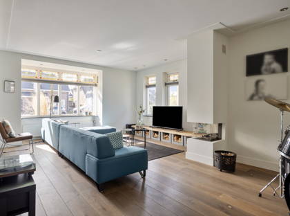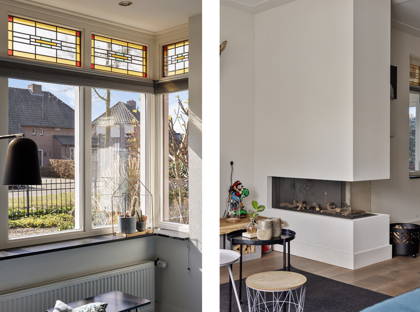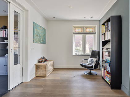 Via de keurig aangelegde voortuin en oprit – met ruimte voor meerdere auto’s – loop je binnen in de woning. De robuuste houten vloer die je in de entree ziet, is doorgelegd in de ruime en speels ingedeelde woonkamer. De erker, glas-in-loodramen, knusse gashaard en de en-suite deuren naar de keuken geven de woonkamer extra veel sfeer.