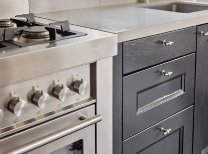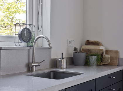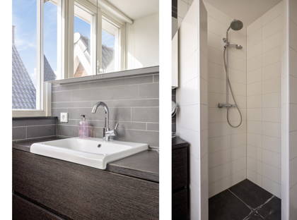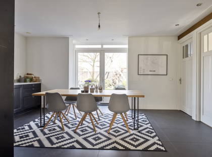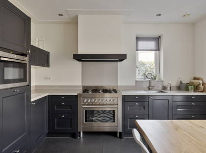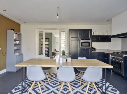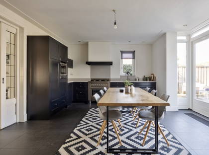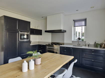 Aan de achterzijde van het huis ligt de royale en gezellige woonkeuken. Dit is het hart van het huis, waar je met het hele gezin samenkomt. Door materialen en kleuren slim te combineren, is de keuken modern en toch sfeervol. In deze keuken vind je een 6-pits gasfornuis met oven, afzuigkap, combimagnetron, koelkast en vaatwasser. Dankzij de grote raampartij in de erker aan de achterzijde, geniet je hier van veel natuurlijke lichtinval.