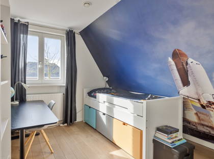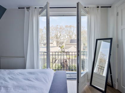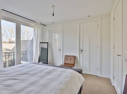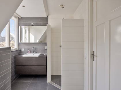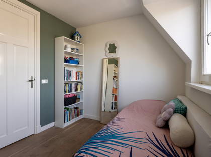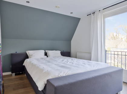 Op de eerste verdieping zijn vier royale slaapkamers, die dankzij de schuine plafonds toch knus aanvoelen. De grootste slaapkamer is voorzien van een balkon – met uitzicht op de fraaie tuin – en twee inbouwkasten. De badkamer is eveneens ruim en modern en voorzien van een wastafel, toilet, ligbad en inloopdouche. Vanaf de overloop brengt een vlizotrap je naar de bergzolder, ideaal voor spullen die je niet elke dag nodig hebt.