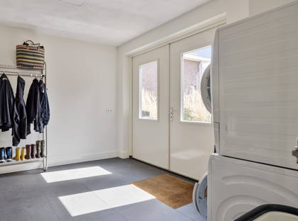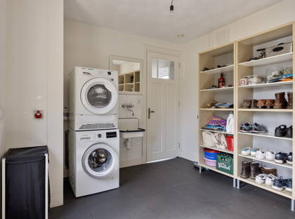 Vanuit de keuken heb je toegang tot de praktische bijkeuken, met ruimte voor een wasmachine, droger en bijvoorbeeld een extra koelkast of vriezer. Daarachter ligt een multifunctionele ruimte, die nu is ingericht als werkkamer. Dit is ook eenvoudig om te toveren tot extra slaapkamer, hobbyruimte of speelkamer. Onder deze werkkamer ligt een kelder, ideaal als extra opbergruimte. Boven de werkkamer en bijkeuken zorgt de zolder voor extra opbergruimte.