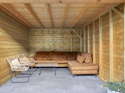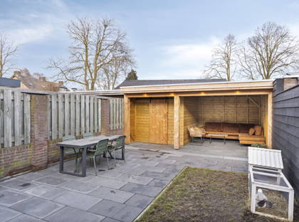 De achtertuin is onderhoudsvriendelijk aangelegd en beschikt over een grote overkapping: perfect voor lange avonden buiten of een fijne loungehoek. Handig is ook dat je hier je fietsen of tuinspullen makkelijk droog kwijt kunt.