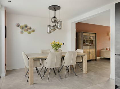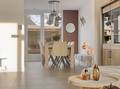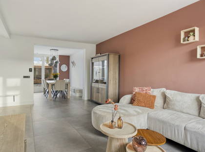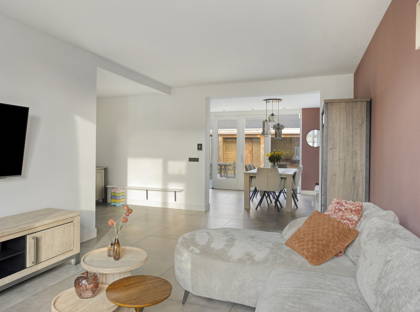Zodra je binnenkomt, valt meteen op hoe praktisch de woning is ingedeeld. De trap is netjes weggewerkt in de hal, waardoor je in de woonkamer echt de ruimte optimaal benut. De woonkamer is licht, strak afgewerkt en groot genoeg voor een royale zithoek én een fijne eethoek.