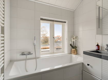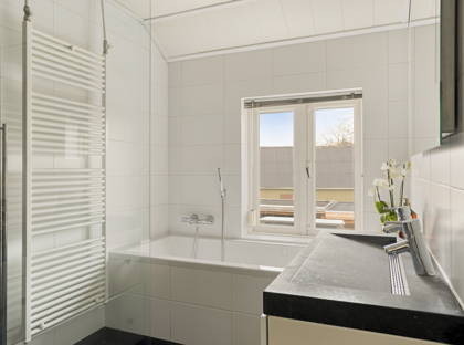 Op de eerste verdieping zijn twee slaapkamers, beide van goed formaat. Daarnaast is er een nette badkamer met ligbad, inloopdouche, designradiator en wastafelmeubel.