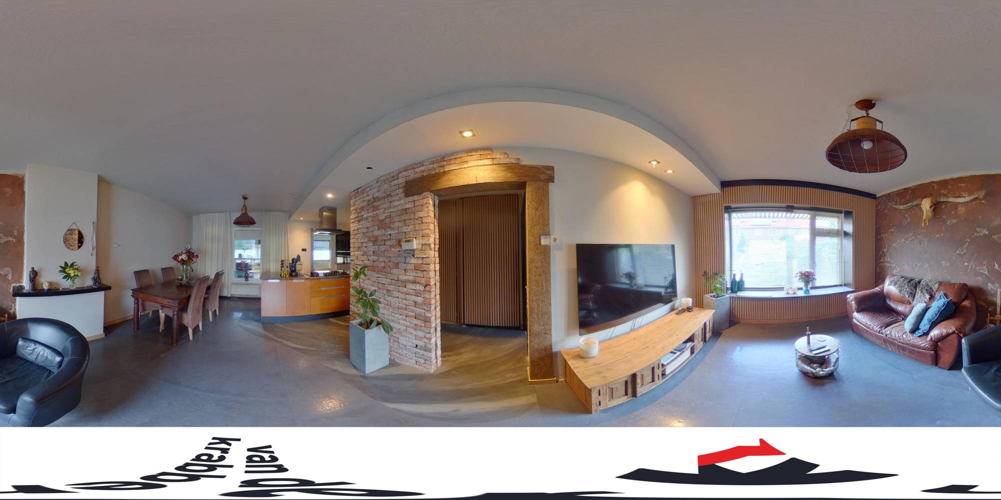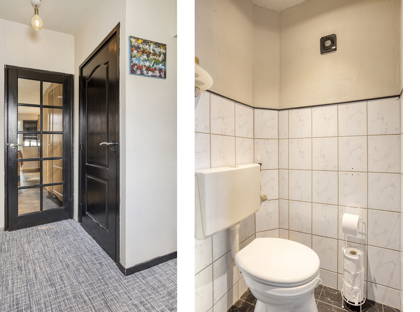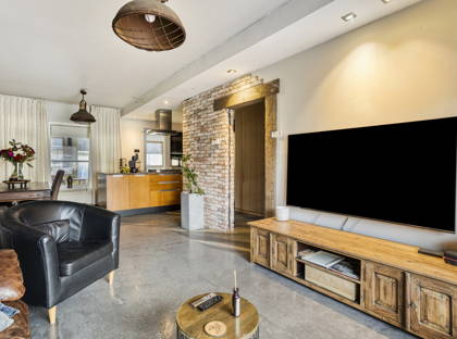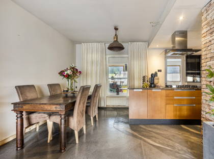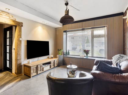 Via de voortuin bereik je de entree van de woning. De hal biedt plaats aan de garderobe, meterkast en toiletruimte. Vanuit hier stap je de woonkamer binnen, die door de grote raampartijen aan zowel de voor- als achterzijde geniet van veel natuurlijk licht. De karaktervolle afwerking met houten details en stoere accenten zorgt voor een warme sfeer.