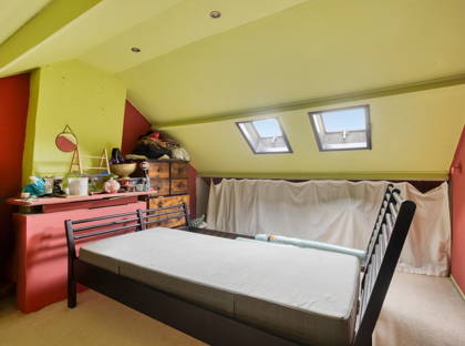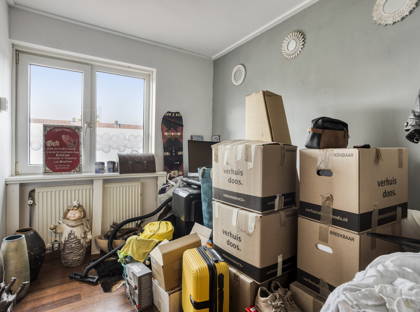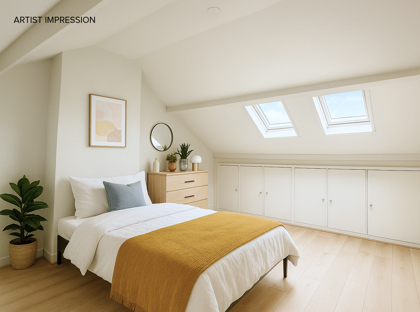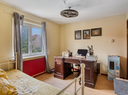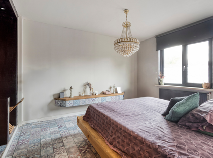 Via een vaste trap bereik je de zolderverdieping. Hier is een vierde slaapkamer gerealiseerd, met 2 dakramen en veel bergruimte achter de knieschotten. Op de overloop vind je de aansluiting voor wasmachine en droger.