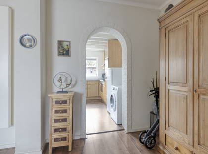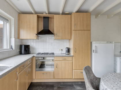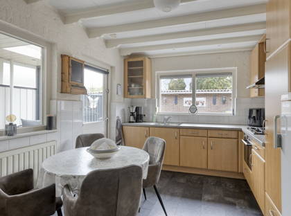 In het huis is extra ruimte gecreëerd door een stuk aan te bouwen. In deze aanbouw bevindt zich de keuken. Deze heeft lekker veel aanrechtruimte en voldoende lades en kasten om al je keukenspullen op te bergen. Verder is de keuken uitgerust met een gasfornuis, afzuigkap, combimagnetron en koelkast. Ook is er plek voor een kleine eettafel om gezellig samen een kop koffie te drinken of te ontbijten.