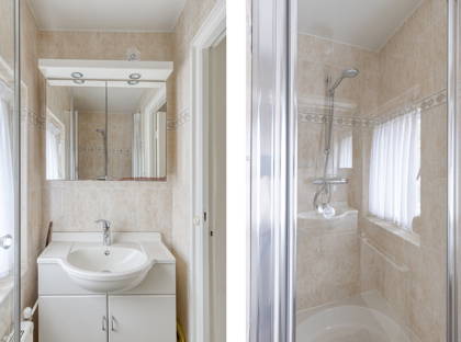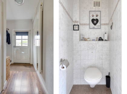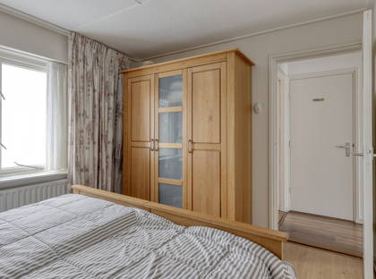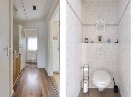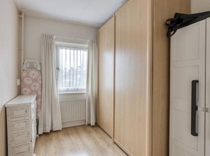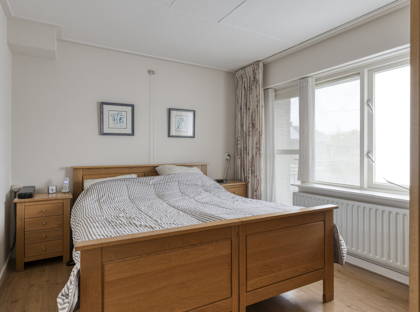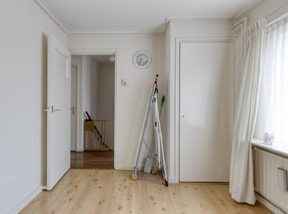 Op de eerste verdieping zijn drie slaapkamers, allemaal netjes en voorzien van een moderne laminaatvloer. De slaapkamers beschikken over rolluiken, net als de woonkamer. Verder is er op deze verdieping een compacte badkamer met wastafel en douche en een apart toilet. Vanuit de overloop heb je bovendien toegang tot de vlieringzolder, waar je al je spullen kwijt kunt die je niet dagelijks gebruikt.