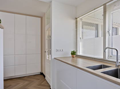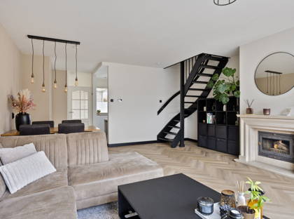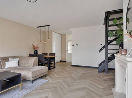 Parkeren is bij deze woning nooit een probleem vanwege de eigen parkeerplaats voor de deur. Vanuit de entree heb je toegang tot de extra berging aan de voorzijde van de woning en tot de woonkamer. Deze is ruim, licht en modern, dankzij de mooie visgraatvloer en de donkere trap. De authentieke schouw met houtkachel zorgt voor een warme sfeer in deze ruimte. Verder is er voldoende plek voor een grote eettafel en een gezellige zithoek.