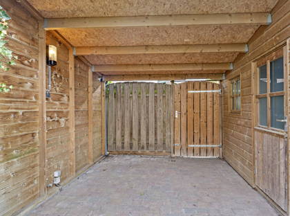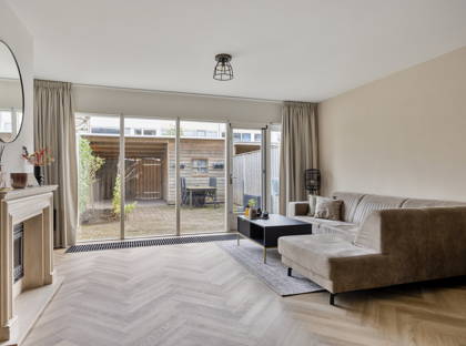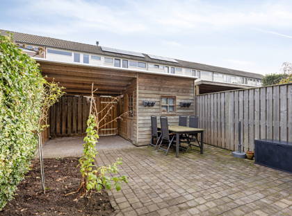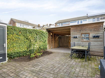 De grote raampartij aan de achterzijde zorgt voor veel licht in huis en biedt mooi zicht op de tuin. Deze is onderhoudsvriendelijk aangelegd en kan naar eigen wens verder ingericht worden. Achter in de tuin is een overkapping en een ruime berging, perfect voor de fietsen en het (tuin)gereedschap.